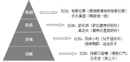 如上圖所示,這可以說(shuō)是馬斯洛需求層次理論在食品行業(yè)中深度的實(shí)踐版。從消費(fèi)者需求層次層面來(lái)劃分的話,食品的價(jià)值屬性由低到高可歸結(jié)為四類:功能、美味、營(yíng)養(yǎng)和情調(diào)。