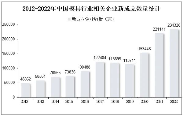 2022年全球模具行業(yè)規(guī)模超過(guò)2.1萬(wàn)億元人民幣,中國(guó)模具行業(yè)市場(chǎng)規(guī)模超過(guò)3200億元人民幣。從行業(yè)競(jìng)爭(zhēng)格局來(lái)看,模具行業(yè)屬于大行業(yè),2012年-2022年,國(guó)內(nèi)模具行業(yè)相關(guān)企業(yè)新成立數(shù)量由48862家增長(zhǎng)到234328家?!颈疚臄?shù)據(jù)、圖表來(lái)源:華經(jīng)產(chǎn)業(yè)研究院、鳳凰網(wǎng)】