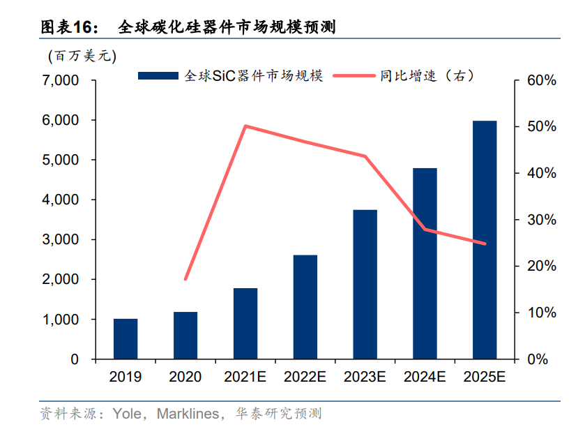 2020 年全球 SiC 器件市場(chǎng)規(guī)模達(dá) 11.84 億美元,預(yù)計(jì)到 2025 年有望增長(zhǎng)至 59.79 億美元,對(duì)應(yīng)復(fù)合年均增長(zhǎng)率為 38.2%。根據(jù)測(cè)算,在碳中和趨勢(shì)下,受益于 SiC 在新能源汽車、光 伏、風(fēng)電、工控等領(lǐng)域的持續(xù)滲透,SiC 功率器件市場(chǎng)規(guī)模有望從 2020 年的 2.92 億美元增長(zhǎng)至 2025 年的 38.58 億美元,對(duì)應(yīng)復(fù)合年均增長(zhǎng)率為 67.6%;以及在5G通信、下游SiC功率及射頻器件高速增長(zhǎng)的需求也將帶動(dòng) SiC 材料市場(chǎng)規(guī)模快速成長(zhǎng)。