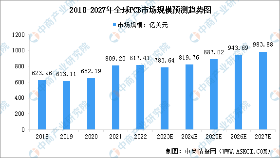 據(jù)行業(yè)知名研究機(jī)構(gòu)統(tǒng)計(jì),2022年全球PCB產(chǎn)業(yè)總產(chǎn)值達(dá)817.41億美元,同比增長1.0%。隨著新科技應(yīng)用如AI、5G網(wǎng)絡(luò)通信、新能源車等持續(xù)帶動,預(yù)估未來5年P(guān)CB行業(yè)仍將穩(wěn)步成長。根據(jù)行業(yè)權(quán)威機(jī)構(gòu)預(yù)測,2022至2027年之間全球PCB行業(yè)產(chǎn)值將以3.8%的年復(fù)合增長率成長,到2027年將達(dá)到983.88億美元。