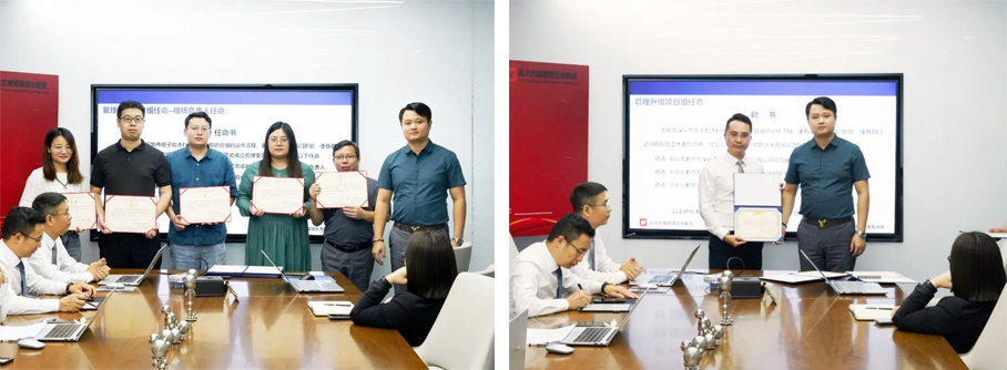 會(huì)上,李總為項(xiàng)目老師頒發(fā)了授權(quán)書(shū),為各項(xiàng)目小組負(fù)責(zé)人頒發(fā)了任命書(shū),共同宣誓投身變革。