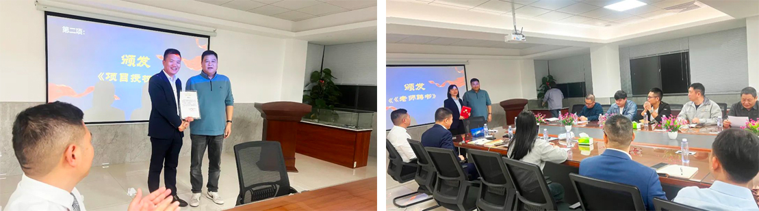 會上,陳總為遠大方略項目組頒發(fā)授權(quán)書,授予項目管理權(quán),同時為項目組老師頒發(fā)聘書,聘請老師為此次改善項目輔導(dǎo)老師,全力推進此次項目開展。