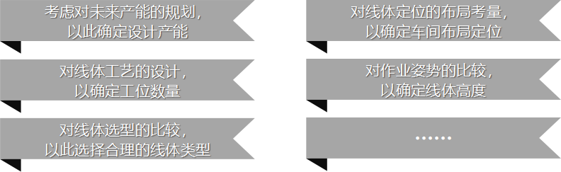 在線體規(guī)劃設(shè)計(jì)項(xiàng)目中,我們會充分考慮對未來產(chǎn)能的規(guī)劃,以此確定設(shè)計(jì)產(chǎn)能;對線體工藝的設(shè)計(jì),以確定工位數(shù)量;對線體選型的比較,以此選擇合理的線體類型;對線體定位的布局考量,以確定車間布局定位