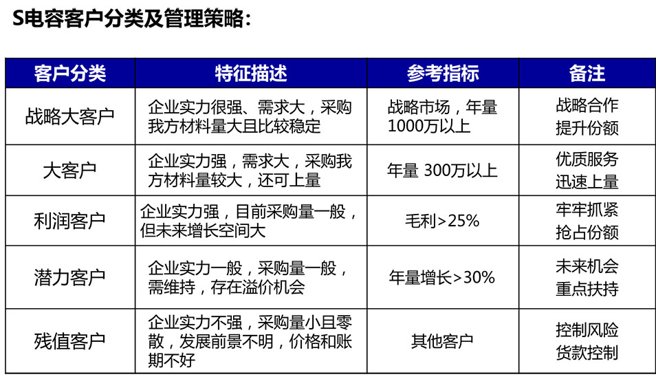 2、明確了電容業(yè)務戰(zhàn)略重點,包括重點市場、重點產(chǎn)品、重點客戶,進行了電容業(yè)務戰(zhàn)略布局,幫助企業(yè)建立了科學的大客戶銷售服務模式。