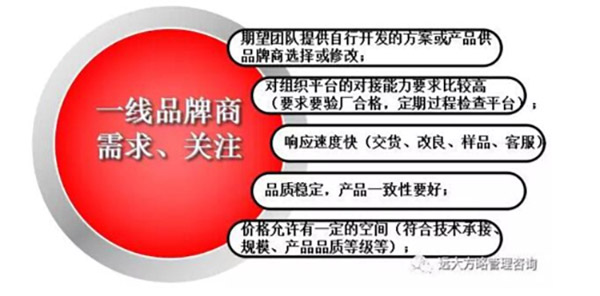遠大方略咨詢師雷志軍老師受邀參加了此次大會,并以“攜手打造共贏供應鏈”為主題做了現(xiàn)場演講!雷老師在會上深入淺出的向各核心供應商總結了歐帝爾的核心競爭力及發(fā)展趨勢,并結合“制造業(yè)價值鏈”模型向各企業(yè)經(jīng)營者分析了在市場競爭日趨激烈、價格不斷降低、成本持續(xù)上漲的環(huán)境下,處于價值鏈上中游的企業(yè)改如何構建自己的競爭力,如何保持自己的利潤率?只有逐步篩選自己的客戶(和優(yōu)質(zhì)客戶合作)、提高自己的技術水平、項目對接能力、內(nèi)部精細化管理等,才能保持企業(yè)良性經(jīng)營和發(fā)展。雷老師接下來向各企業(yè)經(jīng)營者講解了作為品牌企業(yè)對供應商的十大核心需求(見下圖示例),分析了供應商應該從哪些方面為品牌商創(chuàng)造價值,以及如何構建戰(zhàn)略合作關系和合作聯(lián)盟。