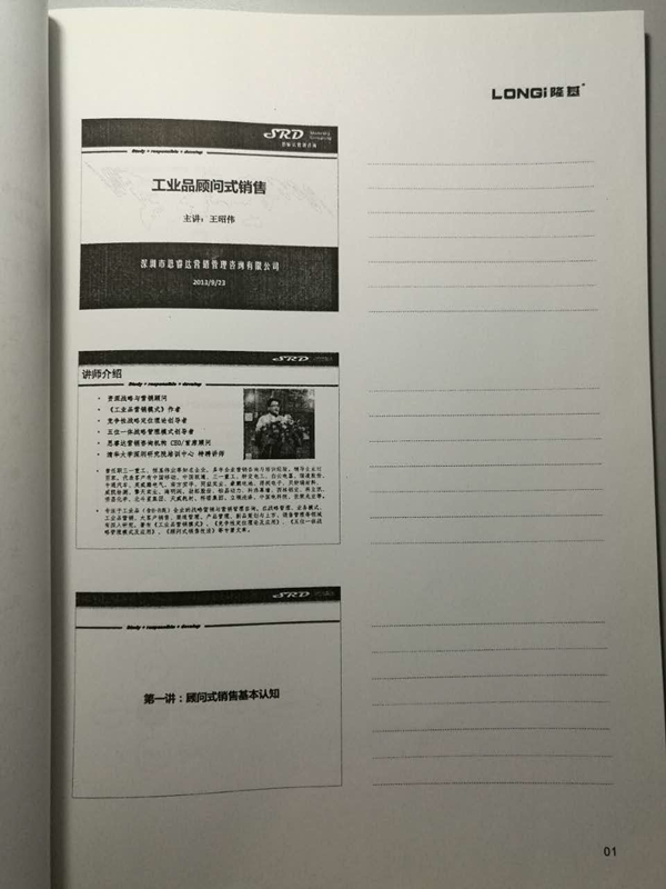 2013年10月7日,應(yīng)沈陽隆基電磁科技股份有限公司領(lǐng)導(dǎo)邀請(qǐng),為隆基電磁培訓(xùn)《工業(yè)品顧問式銷售》,與隆基營銷團(tuán)隊(duì)100余人交流分享了工業(yè)品銷售相關(guān)技能。