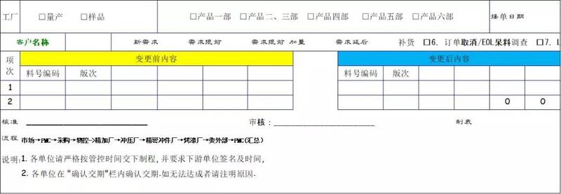 訂單變更單一般由銷售業(yè)務(wù)發(fā)起,PMC調(diào)查匯總;如果變更內(nèi)容在周計劃周期前,則需以補(bǔ)充計劃形式發(fā)布,如果在周計劃周期之后,則需更新SHIIPPING PLAN;訂單變更單模版,如下截圖4: