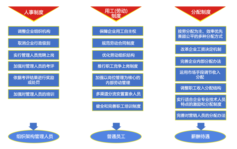從當前各地國資國企改革實踐來看,三項制度改革成為了推進國企改革的重點突破口,是加快企業(yè)改革步伐重要抓手。三項制度改革和核心主要建立人員能進能出(勞動)、干部能上能下(人事)、工資能高能低(分配)的現(xiàn)代企業(yè)制度,提升國有企業(yè)用人體制機制的市場化水平,建立分層分類、業(yè)績導向、差異化安排的長效激勵機制,優(yōu)化企業(yè)組織架構(gòu),提升國有企業(yè)經(jīng)營水平。