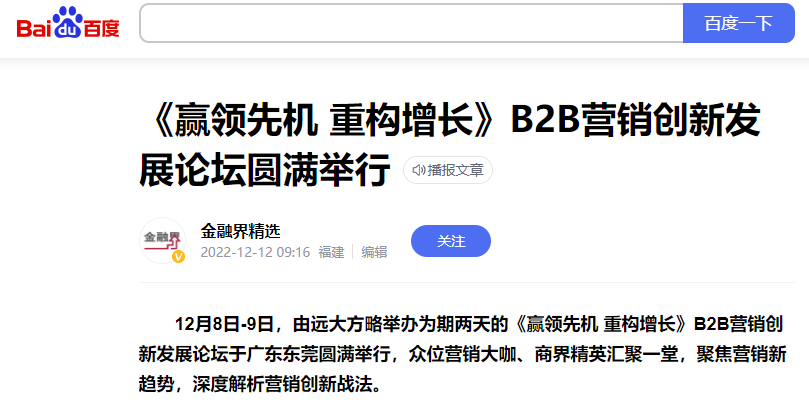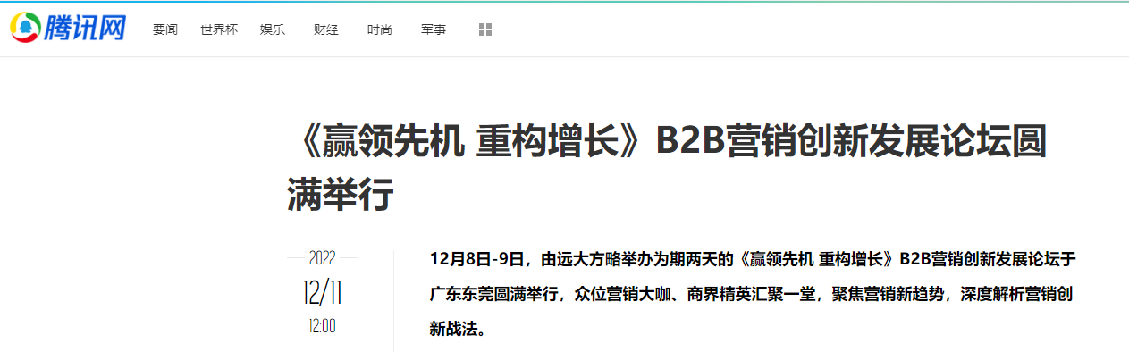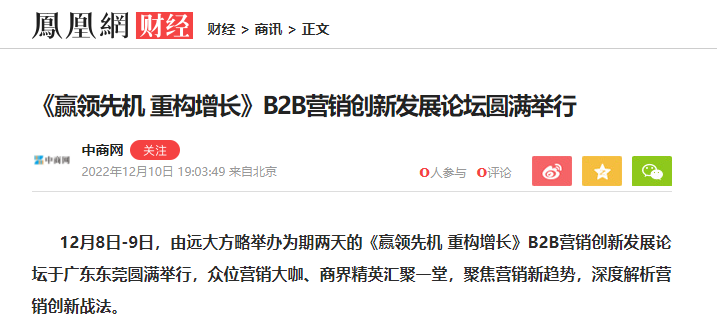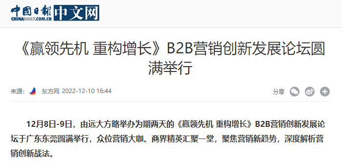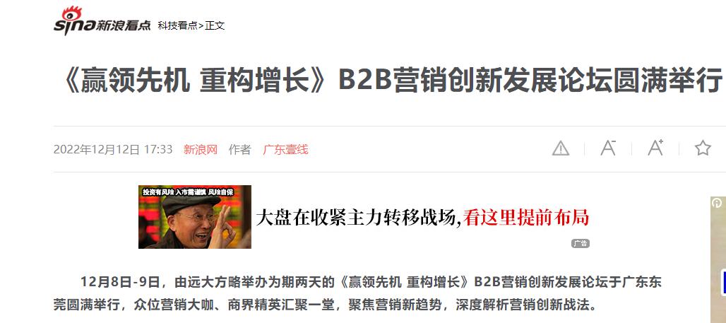 12月8日-9日,由遠(yuǎn)大方略舉辦為期兩天的《贏領(lǐng)先機(jī) 重構(gòu)增長(zhǎng)》B2B營(yíng)銷(xiāo)創(chuàng)新發(fā)展論壇于廣東東莞圓滿舉行,眾位營(yíng)銷(xiāo)大咖、商界精英匯聚一堂,聚焦?fàn)I銷(xiāo)新趨勢(shì),深度解析營(yíng)銷(xiāo)創(chuàng)新戰(zhàn)法。