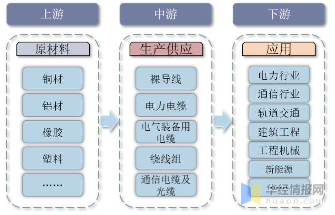 電線電纜行業(yè)產業(yè)鏈上游主要為銅材、鋁材、橡膠、塑料等原材料;中游為電線電纜生產供應環(huán)節(jié),主要產品包括裸導線、電力電纜、電氣裝備用電纜、繞線組、通信電纜及光纖;下游廣泛應用于電力、通信、軌道交通、建筑工程、工程機械、新能源等領域。
