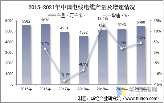 隨著近年來我國城市化、智能電網建設等進程的不斷加快,推動我國電線電纜行業(yè)快速發(fā)展。電線電纜產量也隨之逐漸增長。據資料顯示,2021年我國電線電纜產量為5480萬千米,同比增長4.5%。