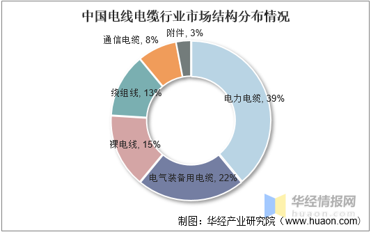 從我國電線電纜市場結構來看,目前,電力電纜是行業(yè)市場占比最大的細分領域,占比達39%,其次為電器裝備用電纜和裸電線,占比分別為22%和15%。