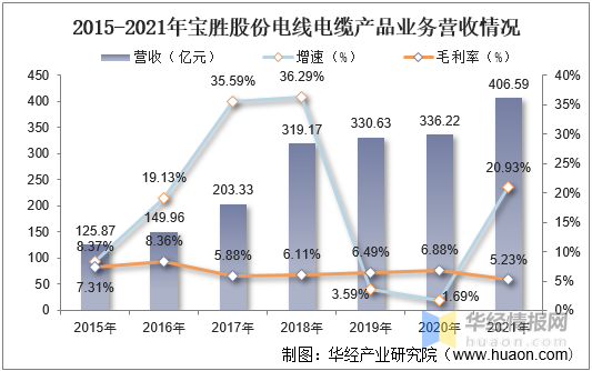 寶勝科技創(chuàng)新股份有限公司(簡稱寶勝股份)是中國航空工業(yè)集團公司旗下的上市公司,公司主要從事電線電纜及電纜附件開發(fā)、制造、銷售及相關的生產技術開發(fā)。公司產品覆蓋裸導體、電氣裝備用電纜、電力電纜、通信電纜及光纜等,是我國電線電纜行業(yè)主要龍頭企業(yè)之一。據資料顯示,2021年寶勝股份電線電纜產品業(yè)務營收為406.59億元,同比增長20.93%,毛利率為5.23%。