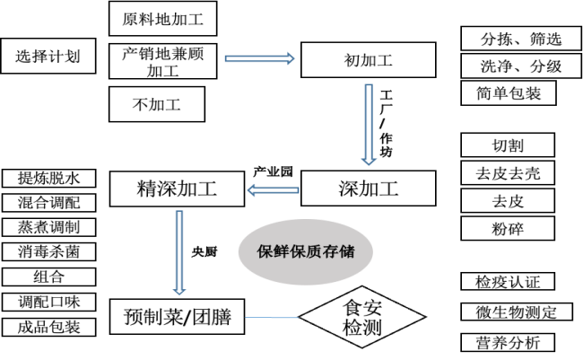 食材加工環(huán)節(jié)主要包含產地預冷、檢驗檢疫、分揀作業(yè)、加工處理、包裝、質量管理及存儲(以上環(huán)節(jié)不含產地端生產/采摘等)。