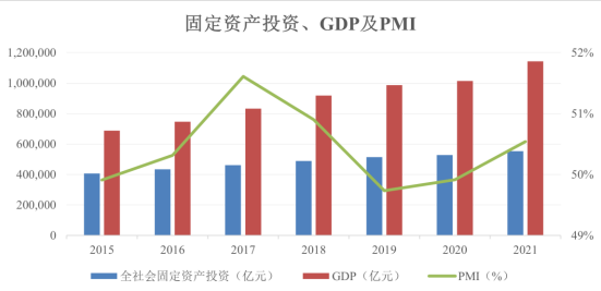 在供需改善的背景下,國內(nèi)制造業(yè)景氣度自 2015 年底起觸底回升。同時中國工業(yè)企業(yè)設備能力利用水平、固定資產(chǎn)投資情況自 2016 年開始穩(wěn)步增長,制 造業(yè)景氣度繼續(xù)上行。2020 年受新冠疫情影響,GDP 增速大幅下降,PMI 小幅提高。2021 年在疫情防控常態(tài)化下,內(nèi)需穩(wěn)步恢復、外貿(mào)快速增長,GDP 增速重回高位,PMI 上升至榮枯分水線之上,顯示出經(jīng)濟擴張的訊號。