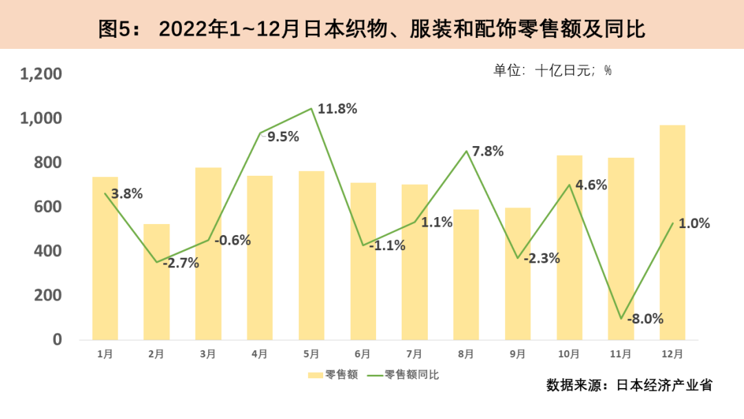 2022年日本紡織品服裝零售額受疫情反復而波動。2022年初日本受到奧密克戎病毒的沖擊,2月紡織品服裝零售環(huán)比驟降29.3%,同比下滑2.7%。2022年3月日本全面解除疫情管控措施,紡織品服裝零售額于4月增速由負轉(zhuǎn)正,5月同比增速達11.8%。2022年7至9月日本迎來第二輪疫情高峰,7月以來日本紡織品服裝零售額連續(xù)三月下降。10月,日本解除入境限制并對國內(nèi)旅游發(fā)放補貼,經(jīng)濟刺激政策下服裝消費開始穩(wěn)步回升,12月日本紡織品服裝零售額環(huán)比上漲18.5%。