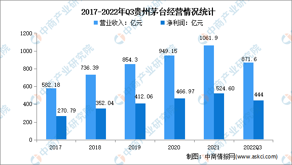 貴州茅臺主導(dǎo)產(chǎn)品“貴州茅臺酒”是世界三大蒸餾名酒之一,也是集國家地理標志產(chǎn)品、有機食品和國家非物質(zhì)文化遺產(chǎn)于一身的白酒品牌。2021年,貴州茅臺累計實現(xiàn)白酒產(chǎn)量17.1萬噸,實現(xiàn)營業(yè)收入1061.9億元,凈利潤達524.6億元。2022年前三季度實現(xiàn)營業(yè)收入871.6億元,凈利潤444億元。