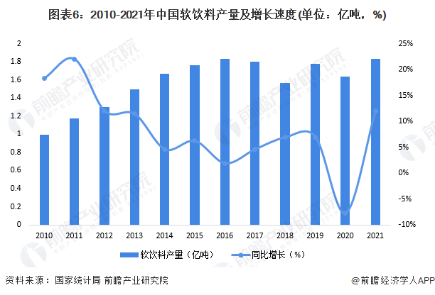 國家統(tǒng)計(jì)局?jǐn)?shù)據(jù)顯示,2010-2021年,我國軟飲料產(chǎn)品產(chǎn)量呈現(xiàn)增長趨勢(shì),但增長速度總體波動(dòng)下降。2017-2018年,我國軟飲料產(chǎn)量下滑,到2019年有所恢復(fù),2019年我國軟飲料產(chǎn)量為1.78億噸,同比增長13.29%;2020年受疫情影響,軟飲料產(chǎn)量為1.63億噸;2021年我國軟飲料產(chǎn)量回升至1.83億噸,同比增長12%,回到與2016年相同的近十年高點(diǎn)水平。