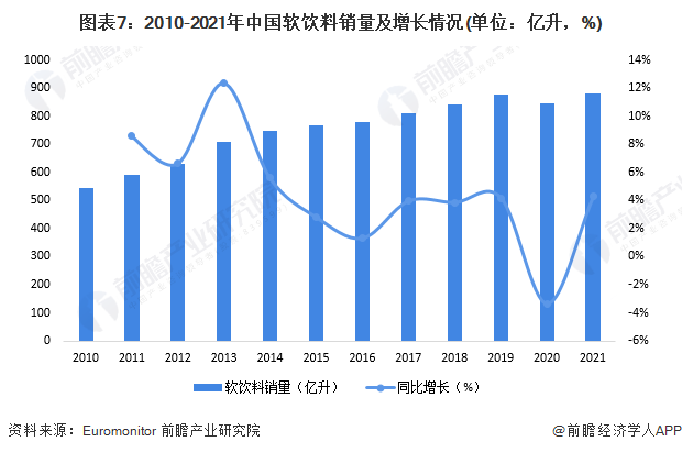 中國作為全球第二大軟飲料市場(chǎng),僅次于美國,近年來軟飲料需求不斷增長。根據(jù)Euromonitor的數(shù)據(jù),2010-2021年,中國軟飲料銷量逐年上升,不過增速有所放緩。2020年疫情期間,大多數(shù)商店關(guān)門,由于居家隱居和禁止社交聚會(huì),人們無法與親朋好友相聚和慶祝,軟飲料銷量下滑3.4%;2021年中國軟飲料銷量為883.05億升,同比增長4.3%。