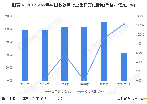 根據(jù)中國海關(guān)總署數(shù)據(jù),2017-2021年,中國軟飲料出口金額持續(xù)上升。2020年受疫情影響,中國軟飲料出口增速降至最低,隨后在2021年增速快速回升至9.2%,2021年全年軟飲料出口金額達(dá)225.81億元。2022年上半年,中國軟飲料行業(yè)的出口規(guī)模達(dá)108.38億元,同比增長12.2%。