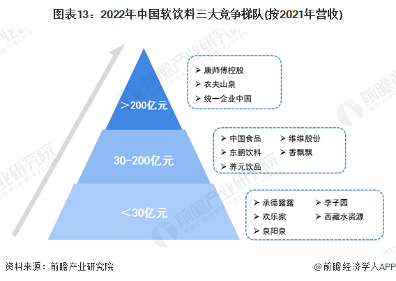 在快速發(fā)展過程中,中國軟飲料行業(yè)整體規(guī)模、品牌影響力不斷攀升。軟飲料行業(yè)依據(jù)企業(yè)在2021年的營業(yè)收入劃分,可分為3個(gè)競(jìng)爭梯隊(duì)。其中,營業(yè)收入大于200億元的企業(yè)有康師傅控股、農(nóng)夫山泉、統(tǒng)一企業(yè)中國;營業(yè)收入在30-200億元之間的企業(yè)有中國食品、東鵬飲料、養(yǎng)元飲品、維維股份、香飄飄等;其余企業(yè)的營業(yè)收入在30億元以下。