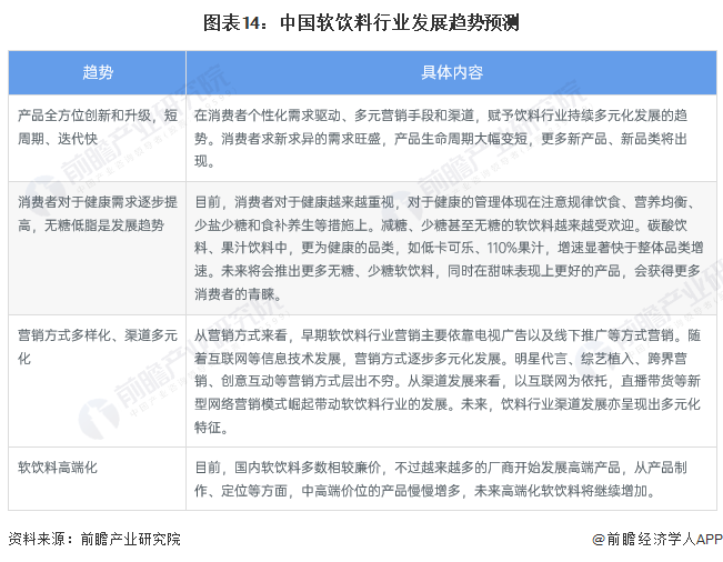 中國軟飲料行業(yè)在消費(fèi)者個(gè)性化需求驅(qū)動(dòng)、營銷手段和渠道多元化發(fā)展的大背景下,軟飲料產(chǎn)品生命周期大幅變短,更多新產(chǎn)品、新品類將出現(xiàn);隨著消費(fèi)者對(duì)于健康越來越重視,減糖、少糖甚至無糖的軟飲料越來越受歡迎。另外,從營銷方式上來看,綜藝植入、跨界營銷、創(chuàng)意互動(dòng)等營銷方式和直播帶貨等新型網(wǎng)絡(luò)營銷模式將成為越來越多企業(yè)和品牌的選擇。