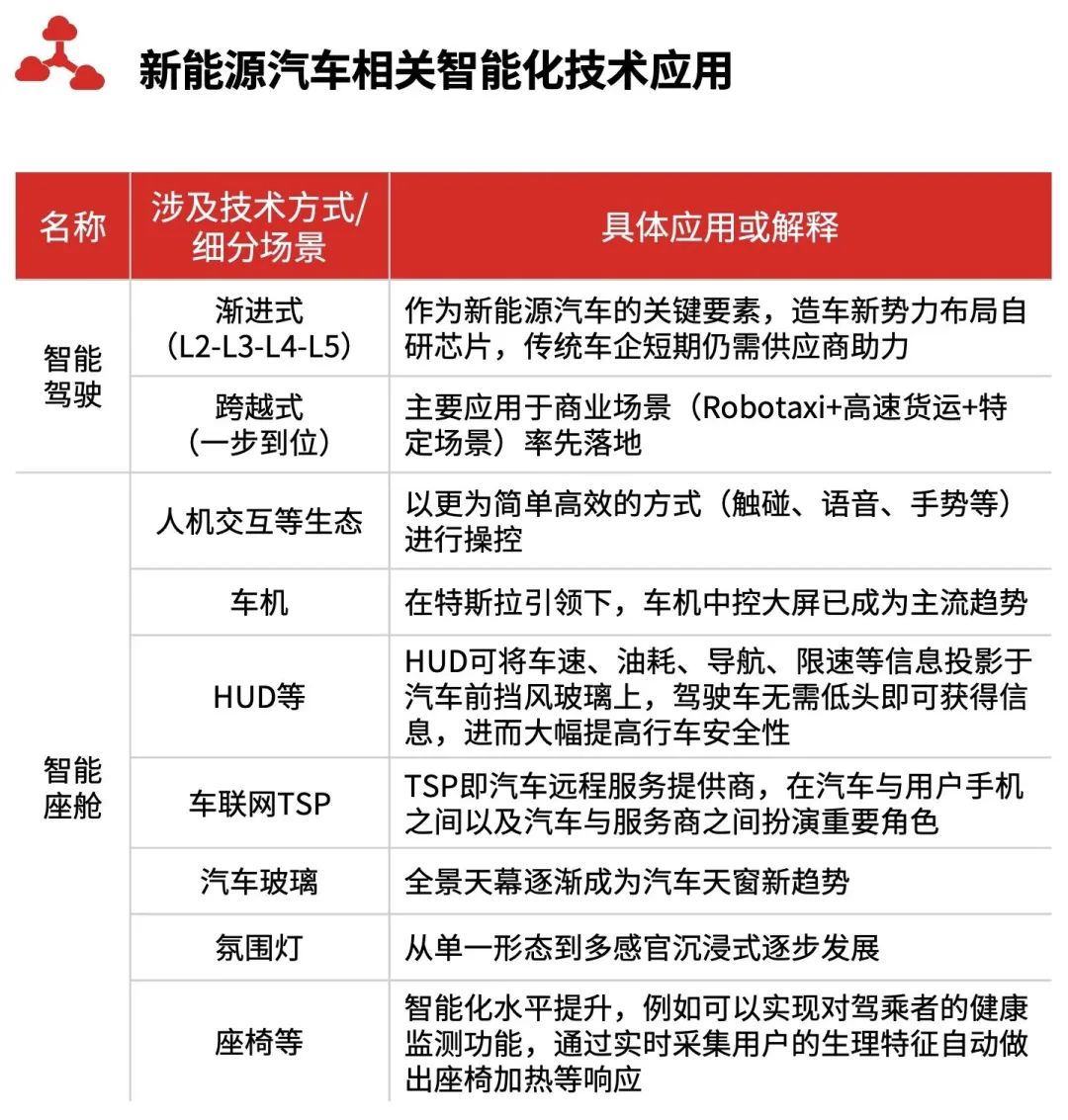 新能源汽車涉及的相關(guān)智能化應(yīng)用非常繁雜,但具體歸類可將其簡(jiǎn)要分為智能駕駛相關(guān)應(yīng)用與智能座艙相關(guān)應(yīng)用兩大分類;具體細(xì)分上,智能駕駛分為漸進(jìn)式與跨越式兩種形態(tài),智能座艙包括人機(jī)交互、車機(jī)、HUD等細(xì)分應(yīng)用。