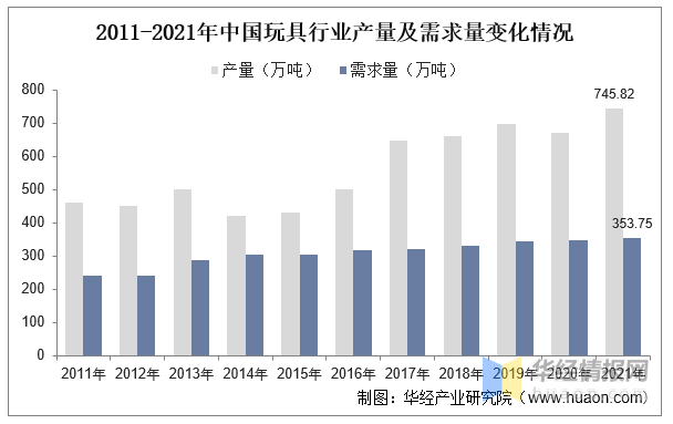 中國(guó)是世界最大的玩具生產(chǎn)和出口國(guó)、第二大玩具消費(fèi)市場(chǎng)。據(jù)統(tǒng)計(jì),近年來我國(guó)玩具行業(yè)產(chǎn)量呈現(xiàn)出波動(dòng)增長(zhǎng)態(tài)勢(shì),2021年玩具產(chǎn)量達(dá)到745.85萬噸,同比增長(zhǎng)10.97%;需求量方面保持穩(wěn)定增長(zhǎng),從2011年的241.87萬噸上升至2021年的353.75萬噸,期間年均復(fù)合增長(zhǎng)率為3.88%。
