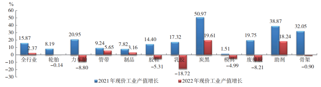 2022年,橡膠行業(yè)現(xiàn)價(jià)工業(yè)總產(chǎn)值增長(zhǎng)2.37%,增幅減少13.50個(gè)百分點(diǎn)。