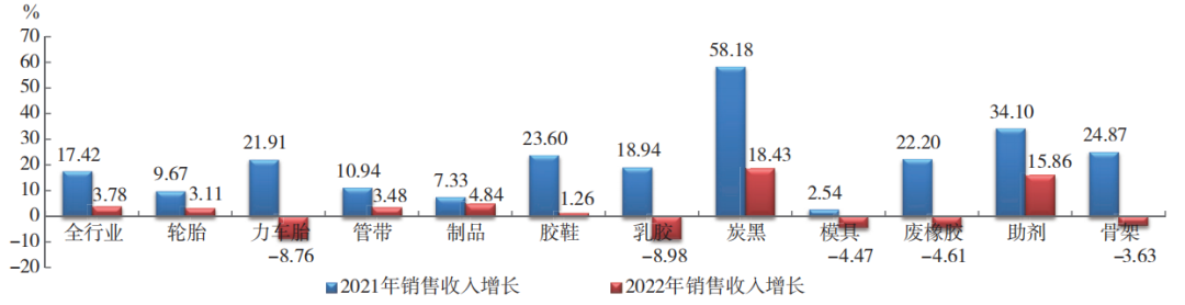 2022年,橡膠行業(yè)銷售收入增長(zhǎng)3.78%,較上年度增幅減少13.64個(gè)百分點(diǎn)。