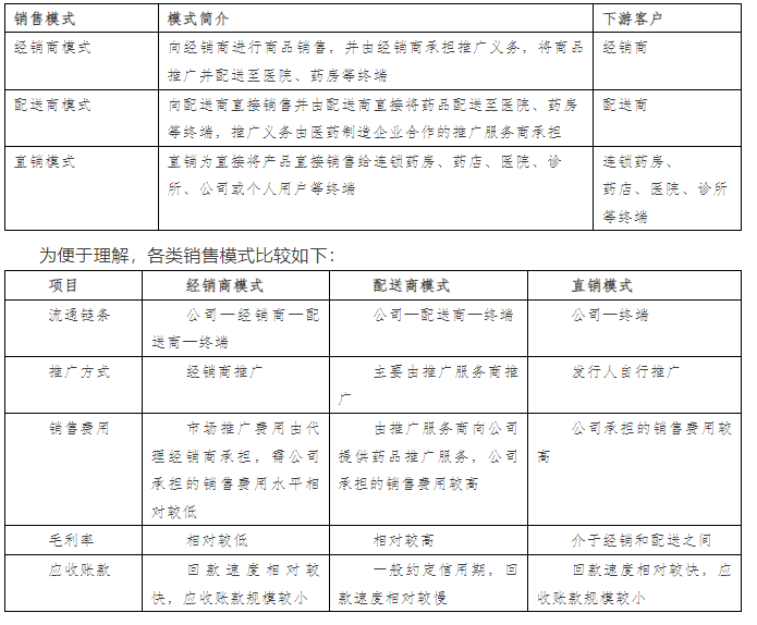 醫(yī)藥制造企業(yè)的銷售模式包括經(jīng)銷商模式、配送商模式、直銷模式,其主要區(qū)別在于推廣方式及銷售費(fèi)用的承擔(dān)。具體情況如下: