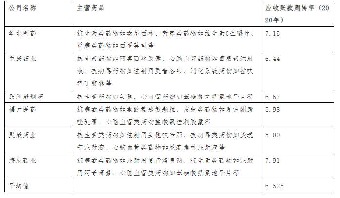 醫(yī)藥制造企業(yè)普遍存在應(yīng)收賬款較大的現(xiàn)象,原因是其下游客戶公立醫(yī)院等較為強(qiáng)勢(shì)。另經(jīng)對(duì)比研究上市公司2020年公開數(shù)據(jù),得出結(jié)論醫(yī)藥制造行業(yè)平均應(yīng)收賬款周轉(zhuǎn)率一般在5-7之間(按產(chǎn)品細(xì)分領(lǐng)域不同可能存在一定差異)。