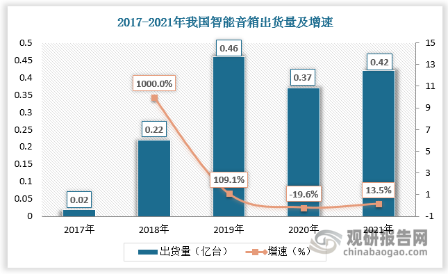 數(shù)據(jù)顯示,2019年我國(guó)智能音箱出貨量達(dá)0.46億臺(tái),較上年同比增長(zhǎng)109.1%;2020年受疫情影響以及廠商價(jià)格補(bǔ)貼力度的減小,我國(guó)智能音箱出貨量有所下降,為0.37億臺(tái),增速為-19.6%;2021年隨著疫情向好以及市場(chǎng)受到智能家居設(shè)備使用增加的推動(dòng),國(guó)內(nèi)智能音箱出貨量回升,約為0.42億臺(tái),增速為13.5%。