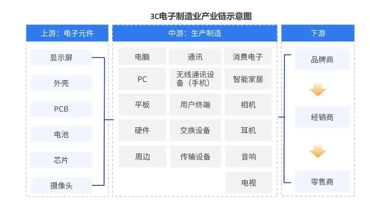 3C電子制造業(yè)產(chǎn)業(yè)鏈由上中下游組成,上游主要是包含顯示屏、外殼、PCB等各類電子元件,中游主要是各類產(chǎn)品的生產(chǎn)制造,如電腦、平板、耳機等;下游主要包含由品牌商、經(jīng)銷商以及零售商;3C電子產(chǎn)品的市場需求的增加,也將促進上中下游整個產(chǎn)業(yè)鏈各個環(huán)節(jié)的需求增加。