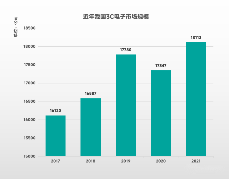 2017-2021年,我國3C電子市場的規(guī)模整體呈擴大之勢,從16120億元增長至18113億元,除2020年受國民經(jīng)濟下行、消費市場整體走弱影響而略有回落外,其余年份皆保持上升。其中,2017-2021年各年份增長率為2.9%、7.2%、-2.4%、4.4%,表明國內(nèi)3C市場運行較為穩(wěn)健,行業(yè)整體處于健康有序發(fā)展狀態(tài)。
