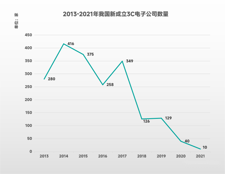 2013-2017年是我國新成立3C電子公司的短暫集中期,年均成立數(shù)量超過300家;步入2018年后,由于行業(yè)成熟度與技術(shù)壁壘持續(xù)提高,新成立3C公司數(shù)量快速降至126家;疫情期間行業(yè)新進入規(guī)模進一步壓縮,2020年為40家,2021年則僅余10家。