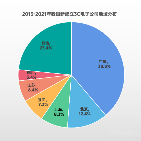 2013-2021年我國新成立3C公司地域分布中,廣東省以38.8%的占比拔得頭籌,遠超排名二三的北京(12.4%)、上海(8.3%)等地區(qū)。