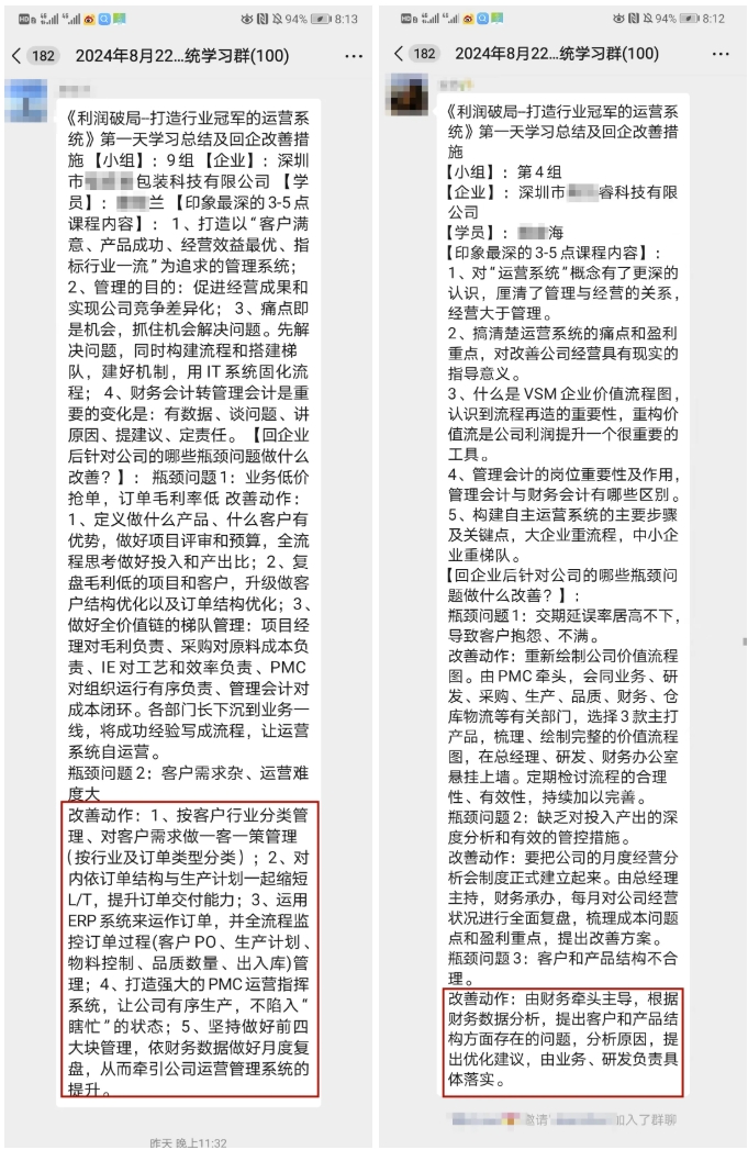 為了讓學(xué)員對(duì)白天的課程理解更加深刻,晚上特意安排了實(shí)戰(zhàn)演練環(huán)節(jié),讓學(xué)員將學(xué)習(xí)的內(nèi)容充分應(yīng)用到自身企業(yè)中,結(jié)合自身企業(yè)特點(diǎn),分析企業(yè)的運(yùn)營(yíng)問題并制定改善措施。老師現(xiàn)場(chǎng)一對(duì)一輔導(dǎo),幫學(xué)員答疑解惑,助力企業(yè)打造一套適合企業(yè)的卓越運(yùn)營(yíng)系統(tǒng)。