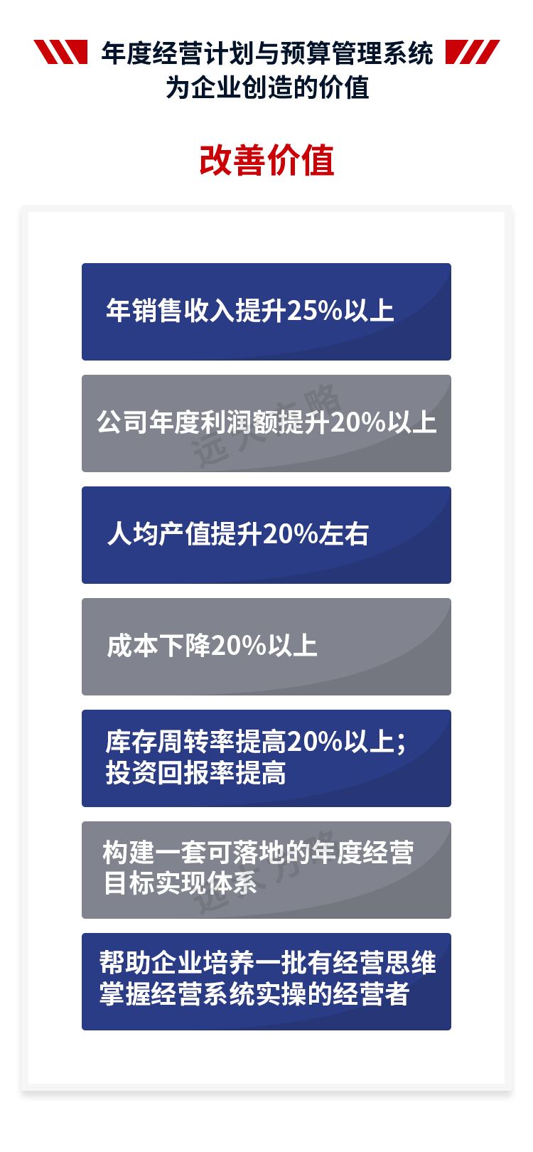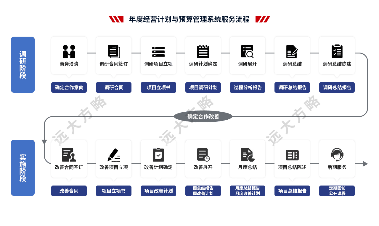 遠(yuǎn)大方略始終遵循不了解不理解企業(yè)的前提下絕不輕易下結(jié)論,正式制定改善方案前必須深入到業(yè)務(wù)一線了解和理解企業(yè)的運(yùn)營(yíng)情況。
